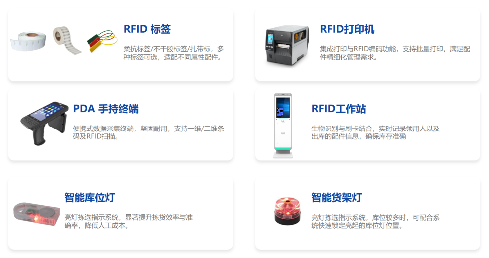 包括RFID标签、PDA手持终端、RFID工作站、库位灯、货架灯、RFID打印机等设备。